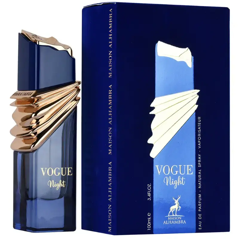 Vogue Night de Maison Alhambra est un parfum Floral Fruité Gourmand pour homme et femme. C'est un nouveau parfum. Vogue Night a été lancé en 2024. Les notes de tête sont Notes aquatiques, Bergamote et Mandarine; les notes de coeur sont Caramel, Jasmin, Fève de tonka et Patchouli; les notes de fond sont Framboise, Ambre gris, Vanille et Musc.